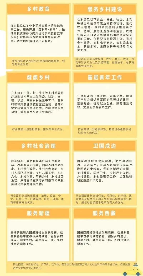 2024—2025年度,由中央财政支持,面向普通高等学校(教育部《全国普通高校名单》所列高校)应届毕业生或在读研究生,按照公开招募、自愿报名、组织选拔、集中派遣的方式,招募选派西部计划全国项目志愿者到西部地区基层工作(含已招募的第二十六届中国青年志愿者扶贫接力计划研究生支教团志愿者)。各地参照全国项目的运行模式和工作要求,组织实施西部计划地方项目。西部计划全国项目和地方项目均可通过西部计划官方网站(http://xibu.youth.cn)报名。西部计划的服务内容