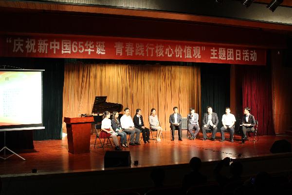 2014年9月28日下午2:30,在国庆前夕,由共青团西安市委员会主办,我校团委承办的“庆祝新中国65华诞,青春践行核心价值观”主题团日活动在我校明德楼负一层演播厅隆重举行。此次主题团日活动也是我校“我爱我家—师生共创和谐校园”主题教育活动的一项子活动。校党委委员、副校长韩权、共青团西安市委纪检组长许浩、西安市教育局副巡视员董三原、西安市教育局团委书记李晓燕、团市委组织部部长郝雅丽、校团委书记成瑶和300余名青年团员共同参加了此次主题团日活动。