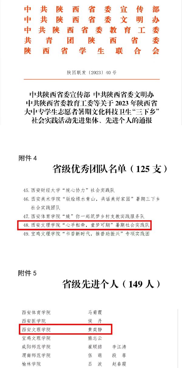 近日,中共陕西省委宣传部、中共陕西省委文明办、陕西省委教育工委、共青团陕西省委、陕西省学生联合会联合下发了《关于2023年陕西省大中专学生志愿者暑期文化科技卫生“三下乡”社会实践活动先进集体、先进个人的通报》我校组织的关爱留守儿童专项实践团队被评为2023年“三下乡”活动省级优秀团队,黄奕静被评为2023年“三下乡”活动省级先进个人。