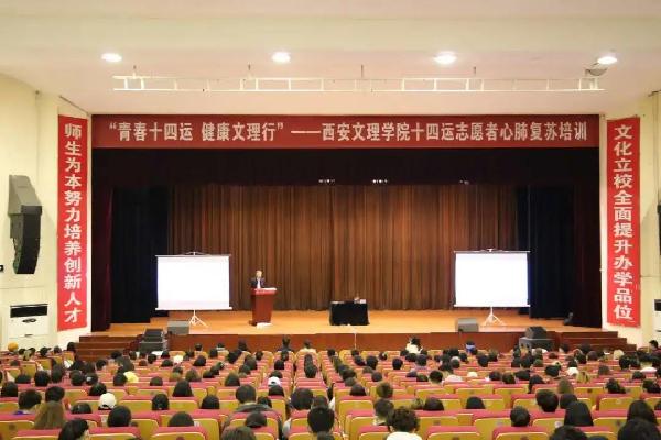 4月14日下午,西安市卫健委、市中心医院在我校大礼堂举办“青春十四运 健康文理行”——乐鱼网页版十四运志愿者心肺复苏培训活动。市卫健委科教处程婕处长,市中心医院虎威院长、郭华副院长、中心医院神经内科护士长周彦芝团队,校团委副书记武文斌及学校十四运志愿者、第十四期青马班学员共计600余人参加了培训活动。